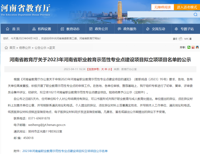 近日,根据《河南省教育厅关于2023年河南省职业教育示范性专业点建设项目拟立项项目名单的公示》,公司机电一体化技术专业入选河南省职业教育示范性专业点建设项目(示范性传统优势专业点)。
